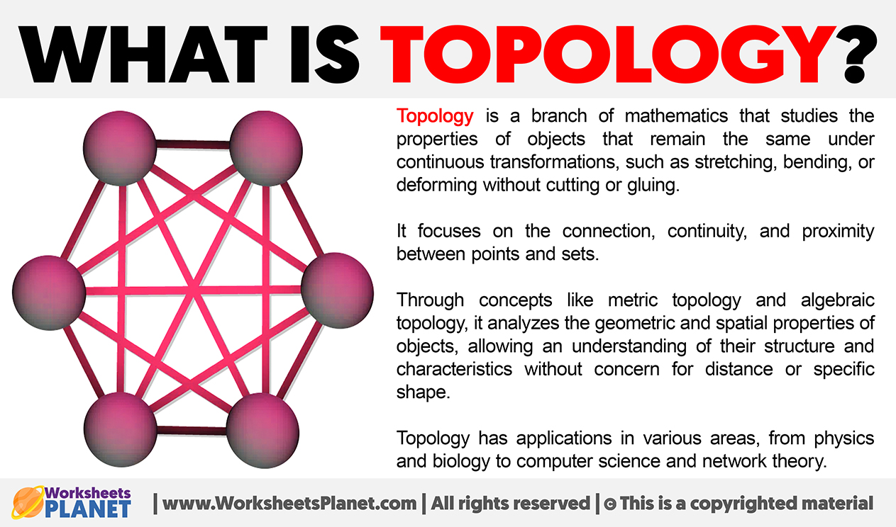A topological space is a set endowed with a structure, called a topology, which allows defining continuous deformation of subspaces, and, more generally, all kinds of continuity. Euclidean spaces, and, more generally, metric spaces are examples of topological spaces, as any distance or metric defines a topology. The deformations that are considered in topology are homeomorphisms and homotopies. A property that is invariant under such deformations is a topological property. The following are basic examples of topological properties: the dimension, which allows distinguishing between a line and a surface; compactness, which allows distinguishing between a line and a circle; connectedness, which allows distinguishing a circle from two non-intersecting circles.